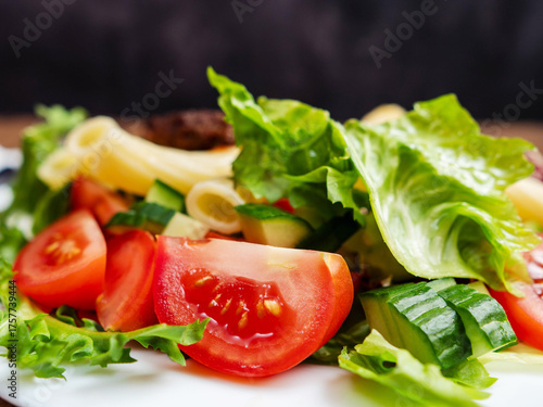 Meal with two tasty burgers, pasta and fresh salad and no sauce. Diet dinner for people with high blood sugar. Healthy food.