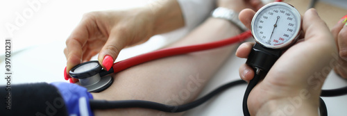 Measurement of pressure to patient by doctor. Medical care in cardiology concept