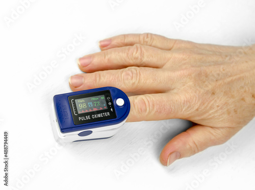 Measurement of saturation in a 60-year-old woman. Health care for the elderly. Pulse oximeter on the finger of an elderly woman