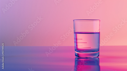 Measuring glass filled with liquid on a reflective surface with soft lighting
