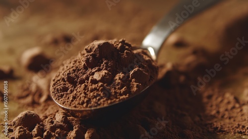 Measuring Spoon Filled with Chocolate Protein Powder