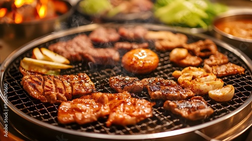 Meat being grilled on a Korean grill, Korean barbecue
