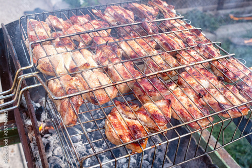 Meat pork beef on the grill cooking process barbecue. traditional outdoor recreation.