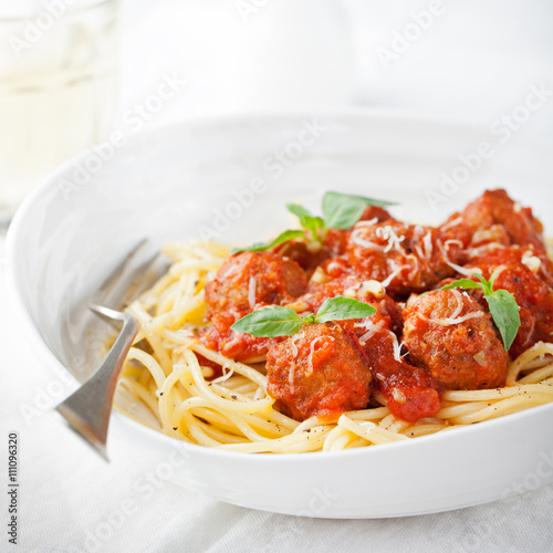 Meatballs in tomato sauce and fresh basil with spaghetti on a white plate