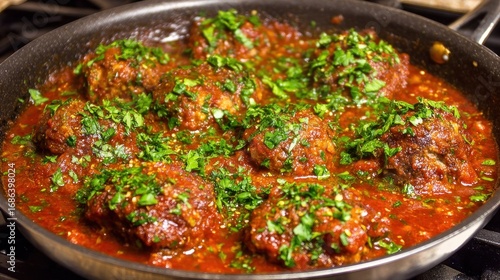 Meatballs in tomato sauce, garnished with fresh herbs