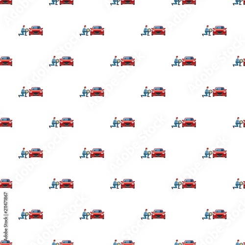 Mechanic changing wheel on red car pattern seamless repeat in cartoon style vector illustration