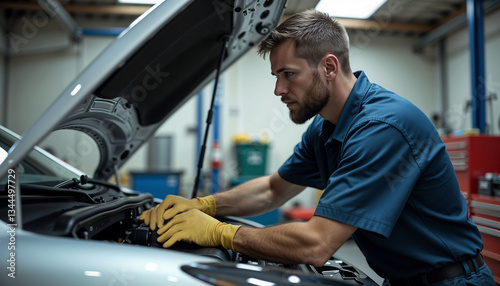 Mechanic cleaning car part in workshop, soft lighting highlighting action and tools used