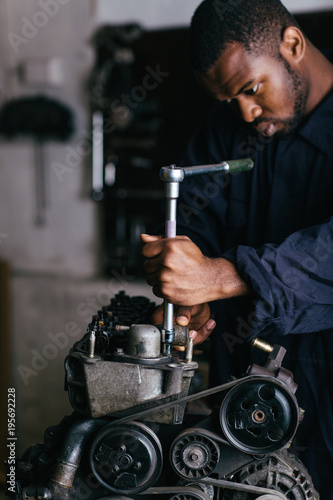 Mechanic fixing an engine for a head gasket repair in a garage.