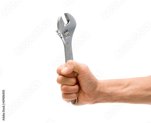 Mechanic hand hold spanner tool in hand isolated on white