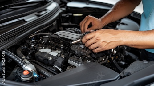 Mechanic hands working under the hood, adjusting engine components with tools in a modern auto shop, focusing on precision and professionalism.
