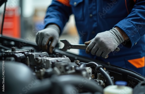 Mechanic in blue overalls, grey gloves tightens car engine bolt with wrench. Focus on hands fixing auto part in clean service garage. Expertise, professional auto repair, automotive maintenance