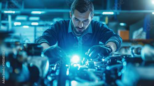 Mechanic in workshop inspecting car engine with flashlight, focusing on engine details, well-lit garage with tools and parts scattered around.