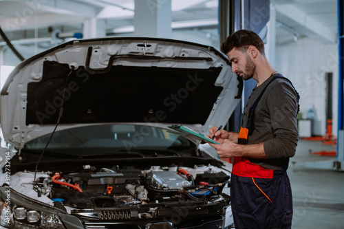 Mechanic man in a uniform write the problem of the car in a map in the modern service center