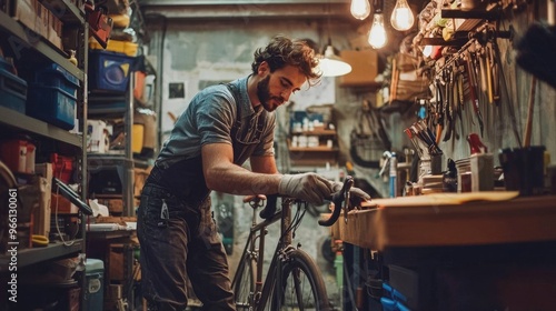 Mechanic man repairing a bicycle in a well-lit garage workshop