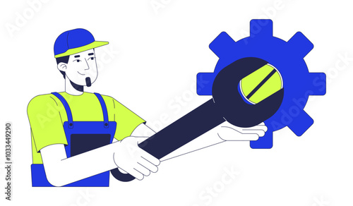 Mechanic man with spanner unscrewing screw on gear 2D cartoon character. Caucasian repairman working with wrench cogwheel isolated person flat vector on white background. Spot illustration colorful