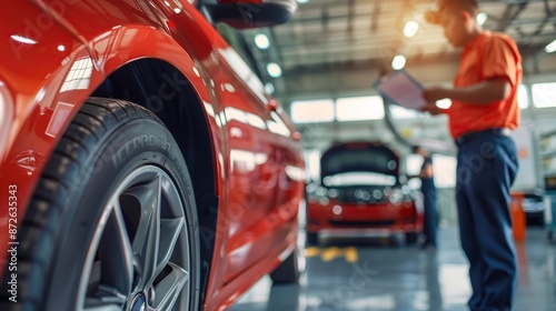 Mechanic show the car checking list for customer with blur his assistant checking red car. Focus on mechanic and customer on the right side. Auto car repair service center.