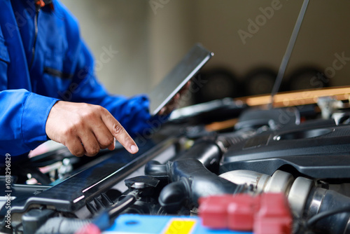 Mechanic standing inspecting car with laptop checking performance and operation of car. Maintenance topic for service, vehicle check up, customer service.