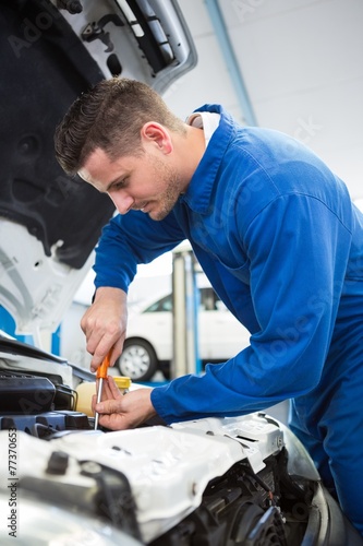 Mechanic using screwdriver on engine