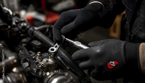 Mechanic using tools to repair a motorcycle engine