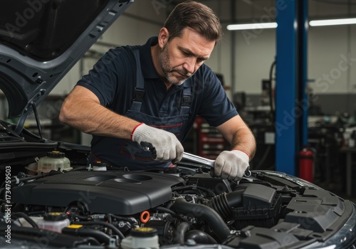 Mechanic working on a car engine in a repair shop