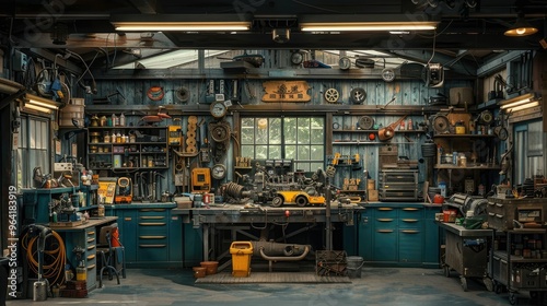 Mechanic working under the hood of a car in a well-equipped workshop with tools and equipment