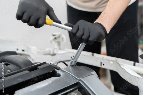 Mechanic works on a vehicle's engine, detailed repairs taking place in a well-lit auto repair shop setting.