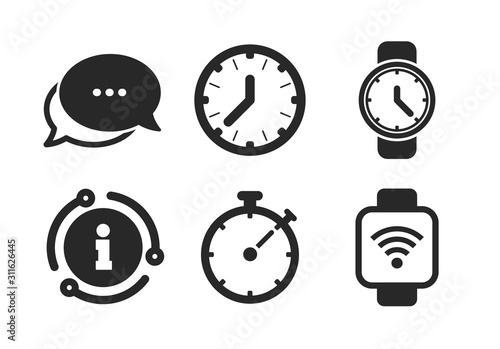 Mechanical clock time, Stopwatch timer symbols. Chat, info sign. Smart watch wi-fi icons. Wrist digital watch sign. Classic style speech bubble icon. Vector