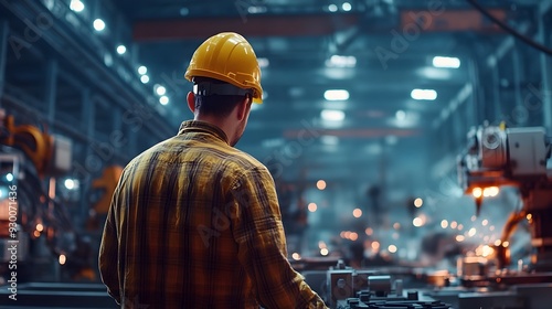 Mechanical Engineer Adjusting Industrial Machinery with Overhead Lighting