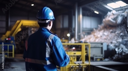 Mechanical engineer inspects waste recycling system in factory.