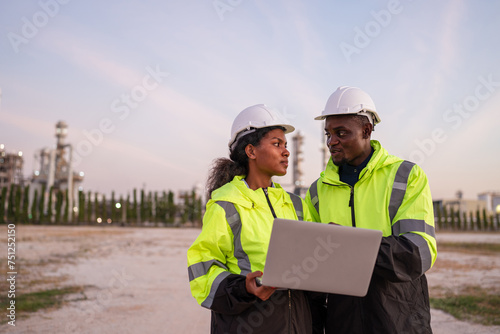 Mechanical engineer working and holding laptop to checking and inspection gas pipeline system new construction project of industrial.
