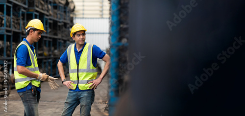 Mechanical man owner small business inspecting old car parts stock on laptop computer while working in old automobile parts large warehouse