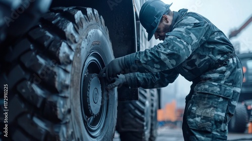 mechanics repair. A soldier in camouflage adjusts a heavy-duty tire, showcasing military maintenance in a rugged environment.