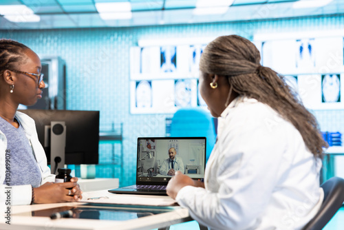 Medic calling the expert physician on video call meeting with a girl, creating a telehealth checkup for a second opinion. Medical staff using high tech equipment at private clinic.
