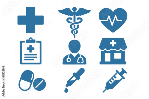Medical and healthcare icon set. Vector collection of flat blue symbols for web and app. Includes doctor, hospital, pharmacy, heart, pulse, syringe, pills, and caduceus.