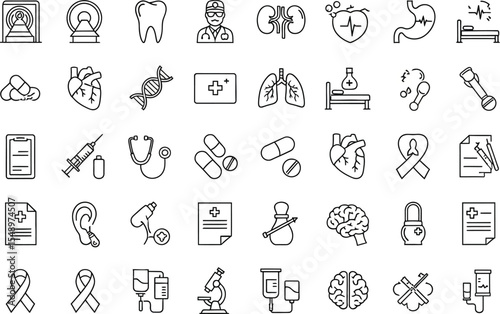 medical and healthcare line icon set – 40 vector symbols including heart, lungs, pills, microscope, syringe, and doctor