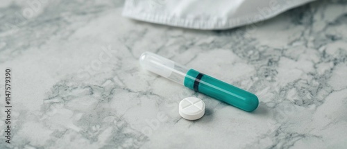 medical challenges awareness concept. A syringe and medication pill are placed on a marble surface, suggesting a medical or pharmaceutical context.