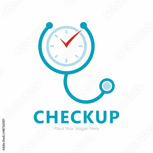 Medical checkup time vector logo template. there are stethoscope and watch symbol