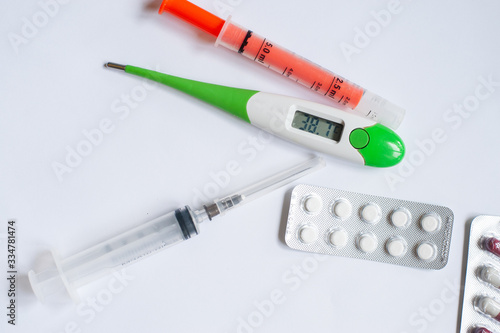 Medical concept. Drugs, thermometer and syringe. Copy space. Top view