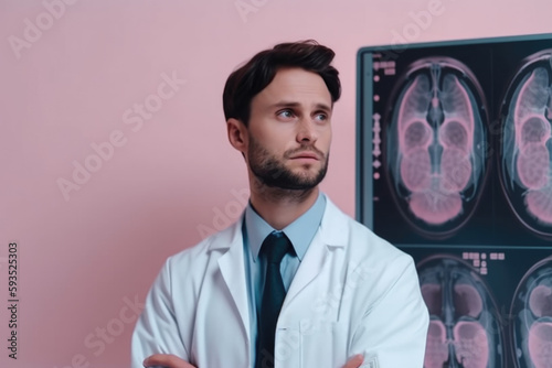 Medical Diagnosis. Experienced neurologist examining a brain scan on a pastel background. Copy space. Medical concept AI Generative