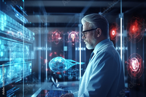 Medical doctor analyzing diagnostic information on a modern virtual screen with network connection. Concept of medical technology and diagnostics.