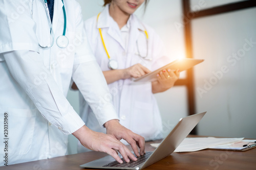 medical doctor in white uniform writing result and prescription in computer laptop, medical concept