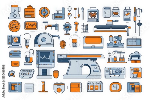 Medical equipment and instruments arranged in a creative and colorful layout showcasing healthcare technology