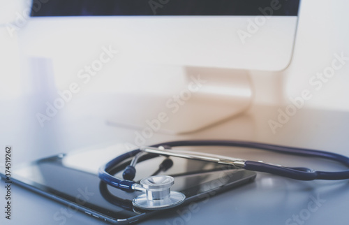 Medical equipment: blue stethoscope and tablet on white background. Medical equipment