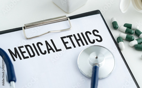 MEDICAL ETHICS text written on the paper with a stethoscope. Medical concept.