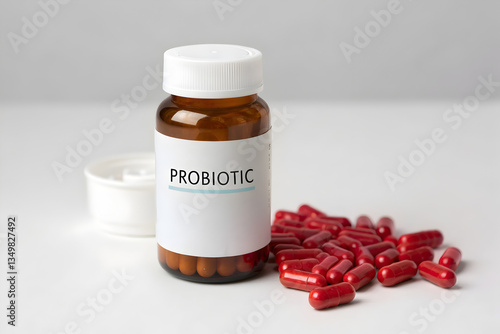 Medical Grade Probiotics in Brown Bottle with Red Pills, Digestive Health Support