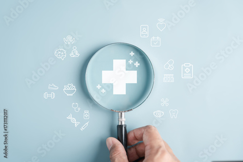 Medical health care insurance concept with hand holding magnifying glass and health icons, protection, screening, diagnosis, treatment, wellness, and preventive healthcare.