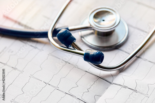 Medical healthcare concept. Selective focus cardiogram with out of focus stethoscope closeup macro background with copyspace and sunflare.