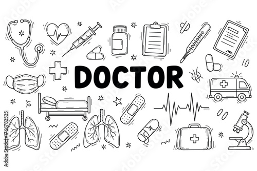 Medical icons and equipment illustrations surrounding 'doctor' text