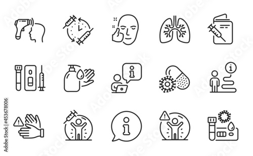 Medical icons set. Included icon as Wash hands, Social distance, Healthy face signs. Lungs, Covid test, Vaccination passport symbols. Blood and saliva test, Coronavirus pills, Dont touch. Vector