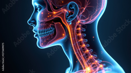 Medical illustration of a human head with visible VNS - Vagus Nerve Stimulation device inserted under skin near neck area.